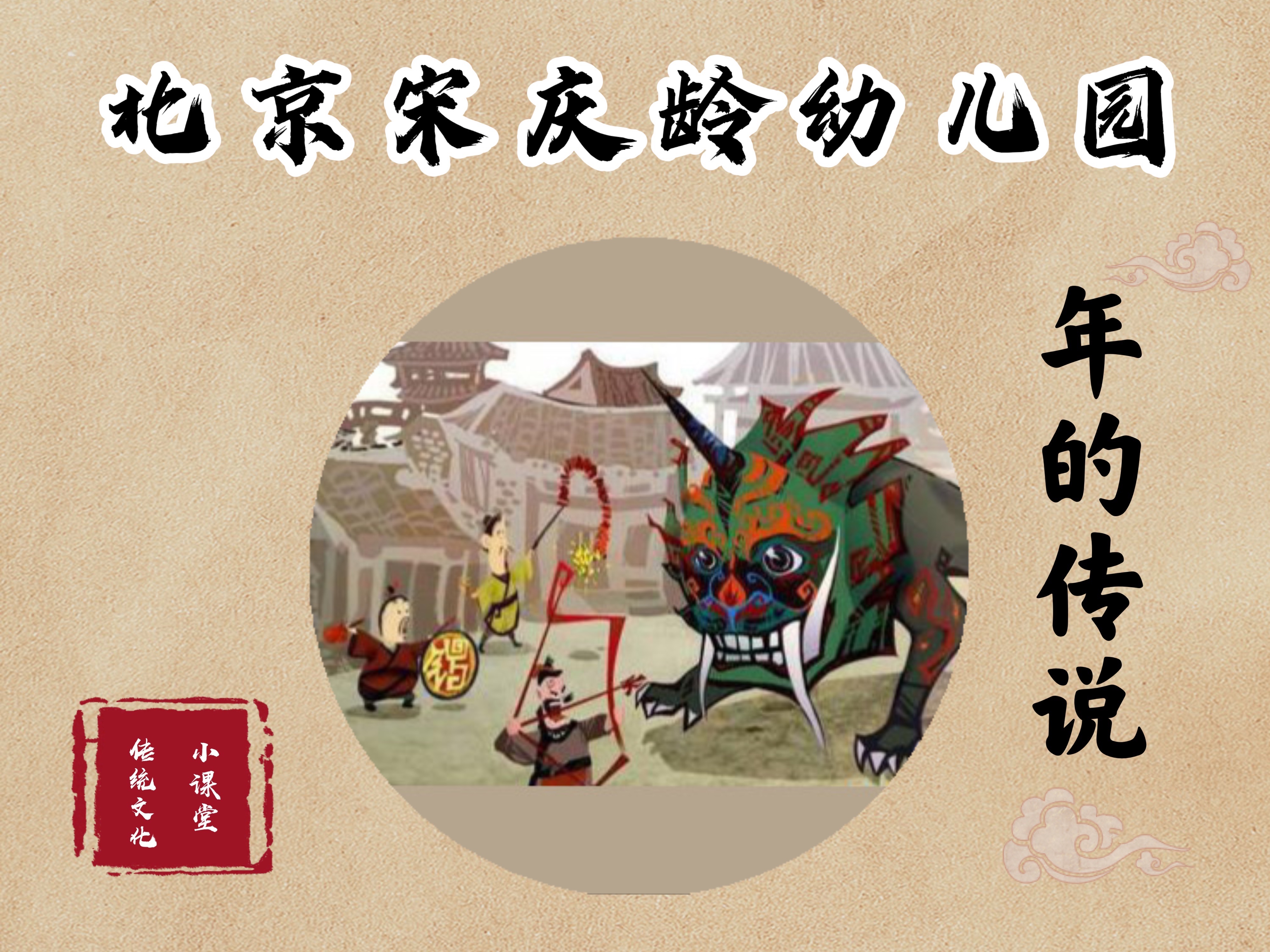 相传,中国古时候有一头叫年的怪兽,头长触角,凶猛异常,它常年居住在海底,每到除夕才爬上岸,祸害庄稼和百姓。因此,每到除夕这一天村子里的男女老少就逃往深山躲避年兽。一年除夕,村里的人们正上山避难的时候,从村外来了个乞讨的老人,乡亲们有的封窗锁门,有的收拾行囊,有的驱牛赶羊,没有人顾及和关照这位乞讨的老人。这时村东头的一位老婆婆走过来给了老人一些食物,并劝他赶快上山躲避年兽,老人却笑道,说:“婆婆若让我在家呆一夜,我定会把年兽撵走。”婆婆有些惊讶,仍继续劝说,老人却只是坦然笑笑,婆婆无奈,只好上山避难去了。半夜时分,年兽闯进村,它发现今年村里与往年不同,村东头老婆婆家门口贴着大红纸,屋内烛火通明。年兽浑身一抖,随即狂叫着扑了过去,将近门口时,园内突然传来噼里啪啦的炸响声,年吓得不敢靠前,原来年最怕红色、火光和炸响,惊慌失色的年狼狈的逃窜了。