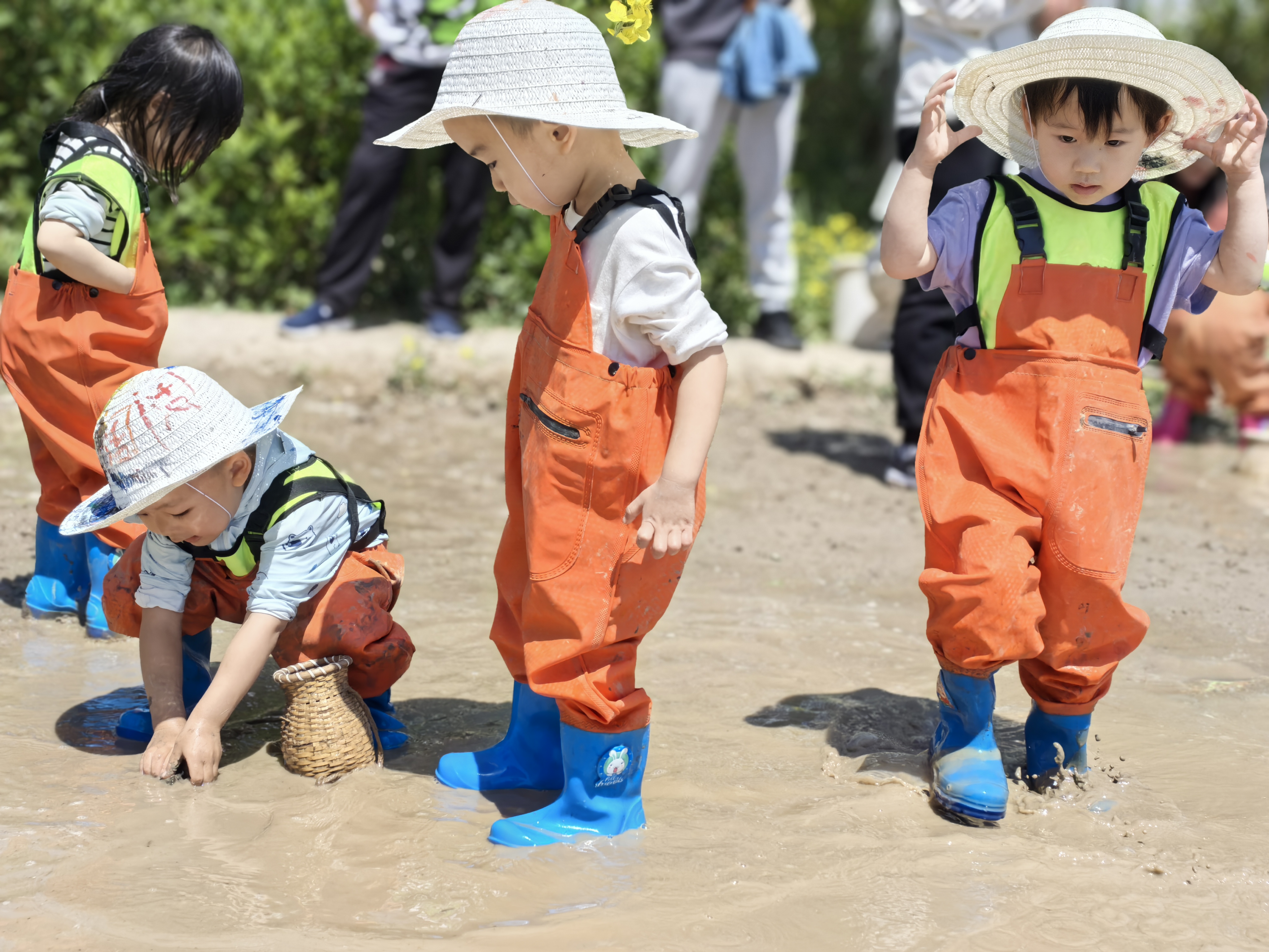 泥塘边,宝贝们化身“小小渔夫”,与泥鳅展开“较量”。泥水飞溅,欢笑飞扬,抓到的泥鳅成为“斗智斗勇”中最珍贵的战利品。