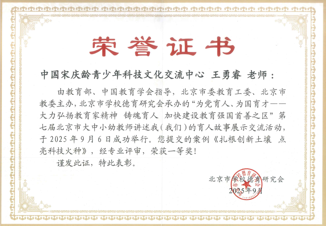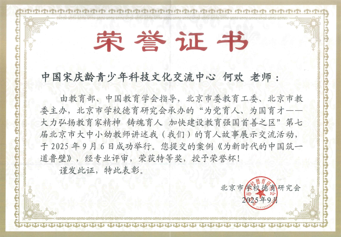 此次佳绩的取得,既是四位教师深耕教育一线、践行育人使命的生动体现,也是宋庆龄青少中心持续推进“三全育人”、培育优秀教育人才的有力见证。未来,中心将继续以教育家精神为引领,鼓励更多教师用专业赋能成长,在育人实践中积累经验、分享教育智慧,为培养担当民族复兴大任的时代新人贡献力量!