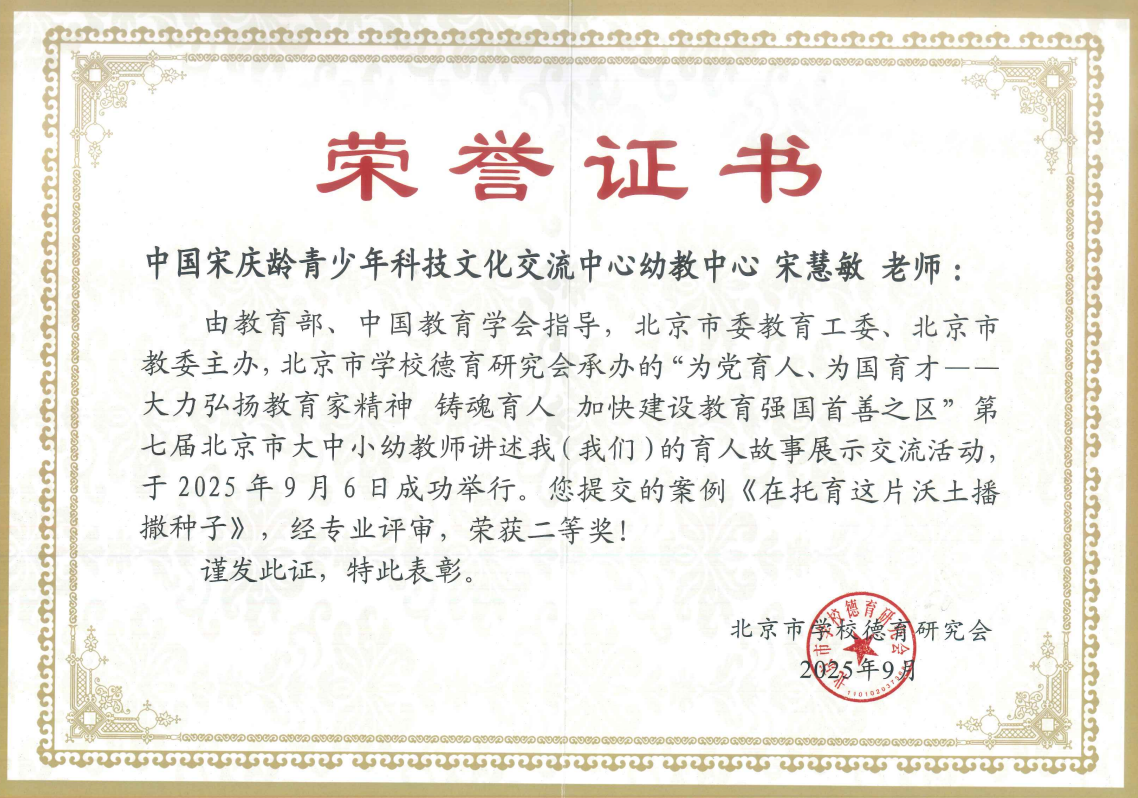 幼教中心宋庆龄托育园宋慧敏老师,以《在托育这片沃土播撒种子》荣获专业二等奖;