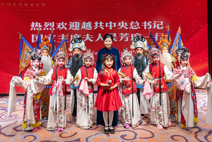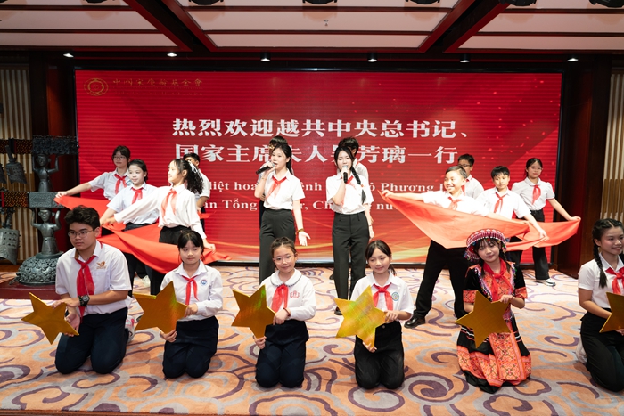 在鹿鸣馆,吴芳璃一行观看了中越两国青少年表演的文艺节目。宋庆龄和平天使艺术团合唱《我和祖国一起成长》,表演京剧《梨园春色早》,越南青少年合唱《我是祖国的花朵》,现场洋溢着温馨友好氛围。